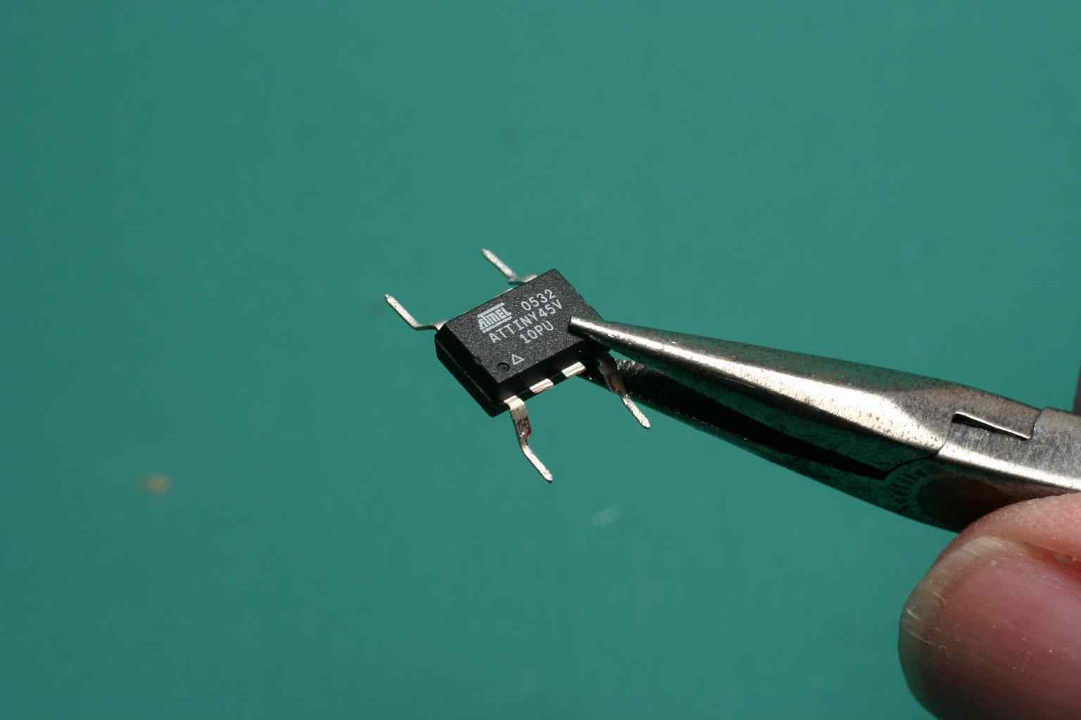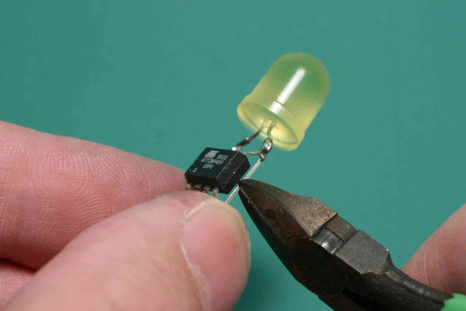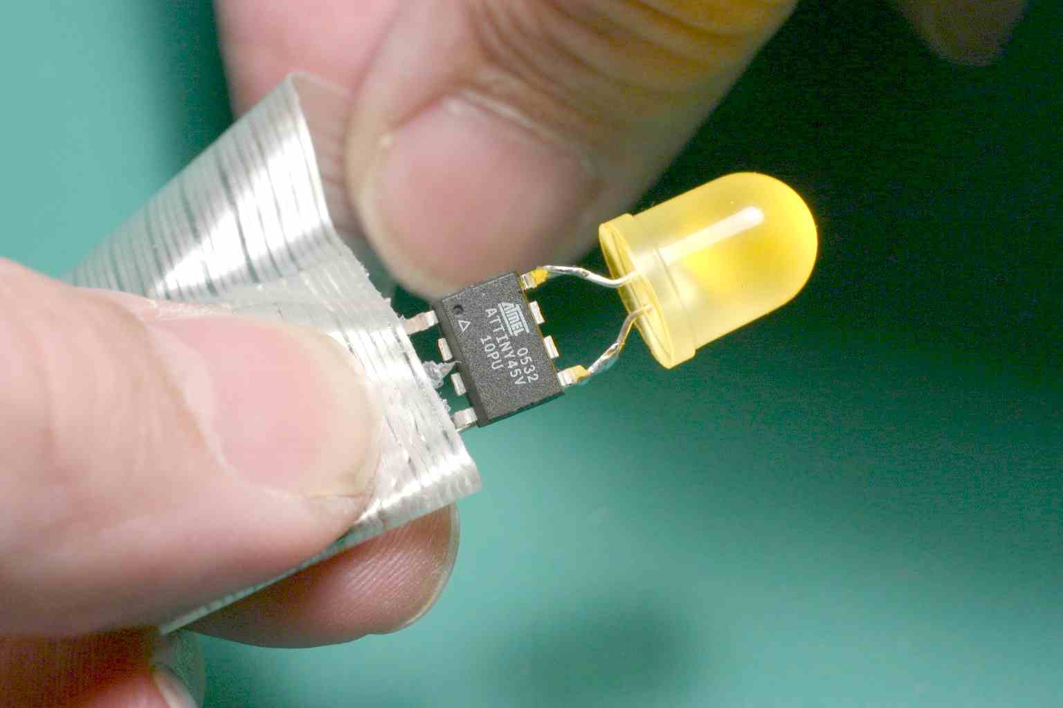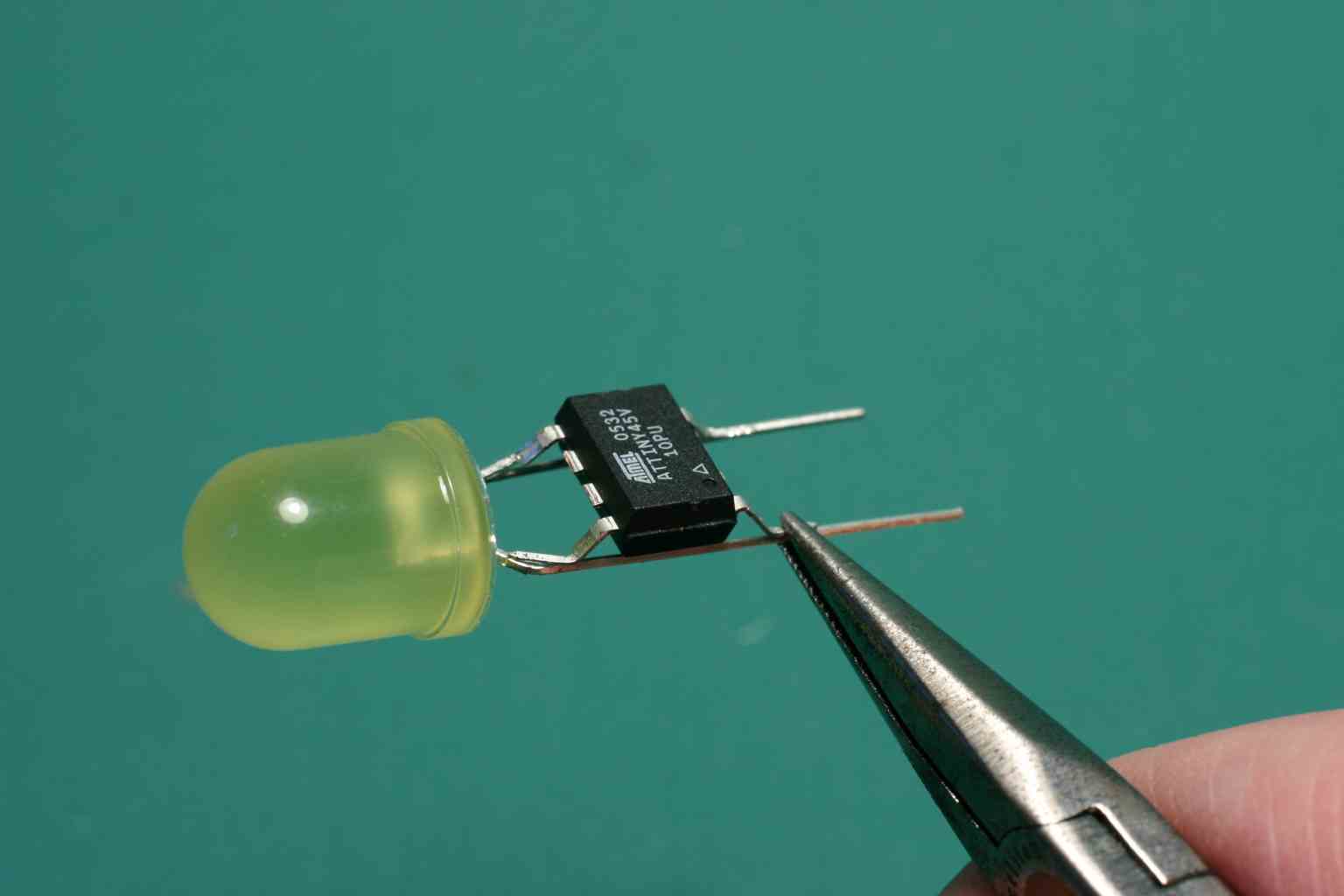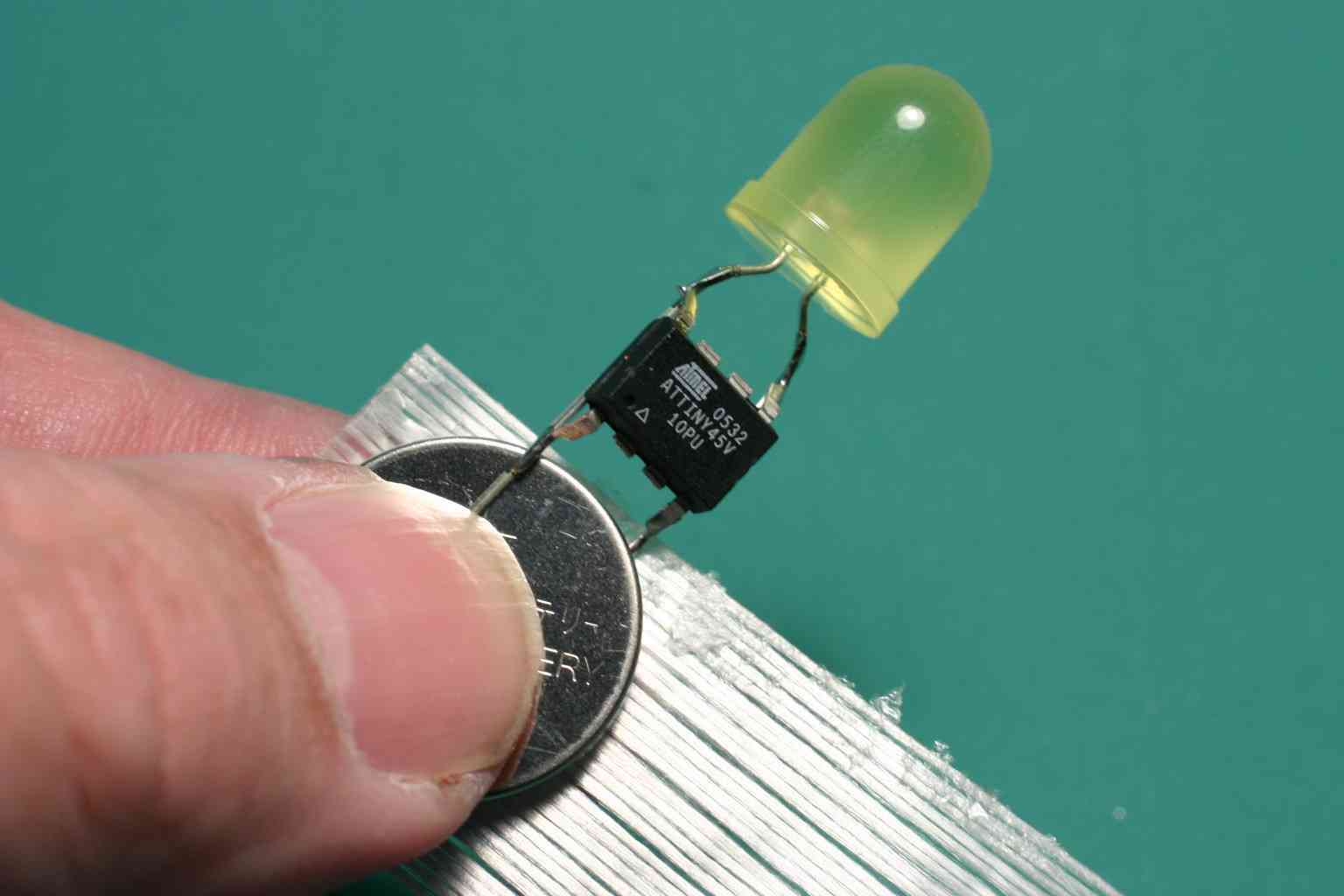 LED Throwies are an inexpensive way to add color to any ferromagnetic surface in your neighborhood. A Throwie consists of a lithium battery, a 10mm diffused LED and a rare-earth magnet taped together. Throw it up high and in quantity to impress your friends and city officials. We met the folks from the lab at the MakerFaire; built a few throwies under their direction; and then computerized one using a part loaded with MorseCompanion that we'd been showing off the day before.; ATtiny45 ; --v-- ; +--- rst -|-----|- vcc --->|-+ ; --- | | | ; ----- | | | ; +--- gnd -|-- --|- keyout ---+ ; ----- ; 8MhzMechanically this worked out great. We just clipped off the unused pins; layed the part across the leads of the LED; soldered; and then cut a gap in the ground lead that the computer would electrically "close" to make the Throwie light. PatCunningham has written an "instructable" for this project and we offer our own version of step-by-step instructions below. Step-by-Step Instructions This project is a "mashup" of two projects offered at the MakerFaire. You will need parts from the GRL Throwie kit and the Cybords MakerProject kit. Step 1 Locate the #1 computer from the cyboards kit. This is a Atmel AVR Tiny45 (ATTINY45V) preprogrammed with MorseCompanion. Remove the label which is for identification only. Step 2 Remove unused pins. Bend the center pins back and forth until they break off. Do not remove the pins located in the four corners of the part. Step 3 Bend remaining pins. Bend each pin 45 degrees away from the center of the part. Then bend the thiner part of each pin an additional 45 degrees until they are horizontal. Step 4 Locate a large light-emitting diode (LED) in the GRL kit. Bend both of its pins so that it is has the same spacing as the pins on the computer. Step 5 Position the computer. Orient the computer so that the top-side (pins 5 and 8) overlay the LED. The pin one marker, a small dot molded into the computer's plastic case, will align with the longer of two leads. Hold the computer in place with needle-nose pliers. Step 6 Solder the pins. Heat both leads and then apply a small amount of solder. Wait for it to flow. Hold the LED by hand and solder the fourth pin the same way. The computer/throwie should look like this. Step 7 Use diagonal cutters to cut the ground (minus) lead between the two pins on the computer. Make a second cut nearby and remove a small amount of metal so that current cannot flow except through the computer. Step 8 Locate the Lithium-Ion battery in the GRL kit. Identify it's plus (+) side. Step 9 Test the part by holding the longer lead against the plus side and the shorter lead against the minus side of the battery. If the light does not light and blink, try reversing the connection or try a fresh battery. Step 10 Tape the leads. Tape one side, fold, then tape the other. Start at the end of the tape so that there is free tape remaining after taping both sides. Step 11 Locate a Rare-Earth magnet in the GRL kit. Place it against the first side taped and continue tapeing so that the LED leads and the magnet are held firmly in place. This completes the ComputerizedThrowie. It should be blinking brightly. The magnet is strong enough to lodge the throwie agains ferrous serfaces even when thrown from some distance. Here the thowie is adhearing to the handle of the pliers used to construct it. See animated versions of these pictures here: We don't yet know how long the batteries will last. The non-computerized versions last a week or so. The computer takes some additional power but saves some power too by not running the light continuously. The computer will detect low voltage and reset. There may be sufficient battery life left for other applications.