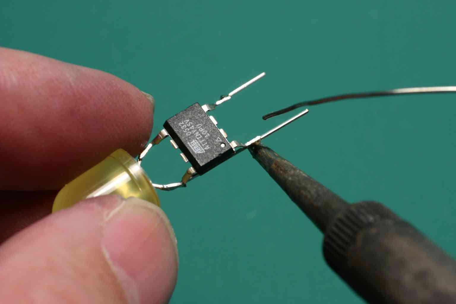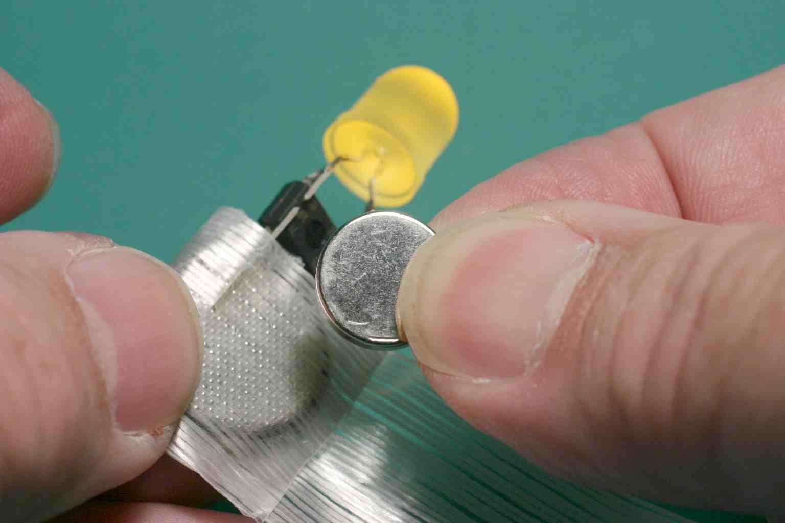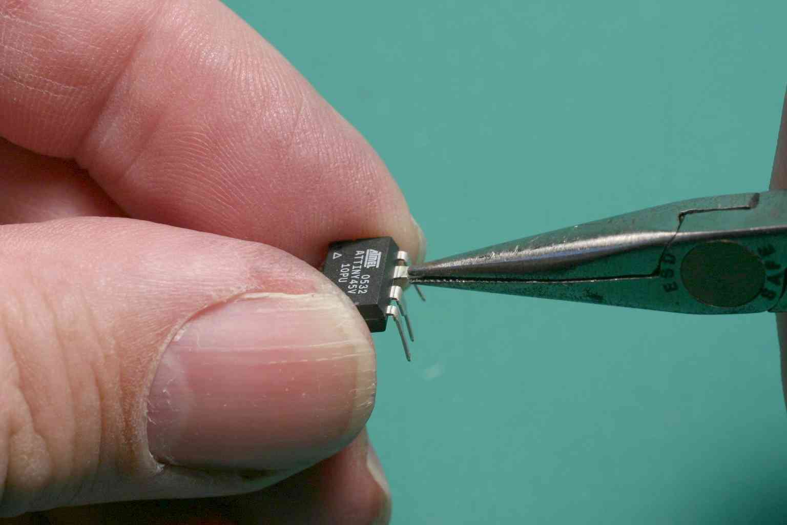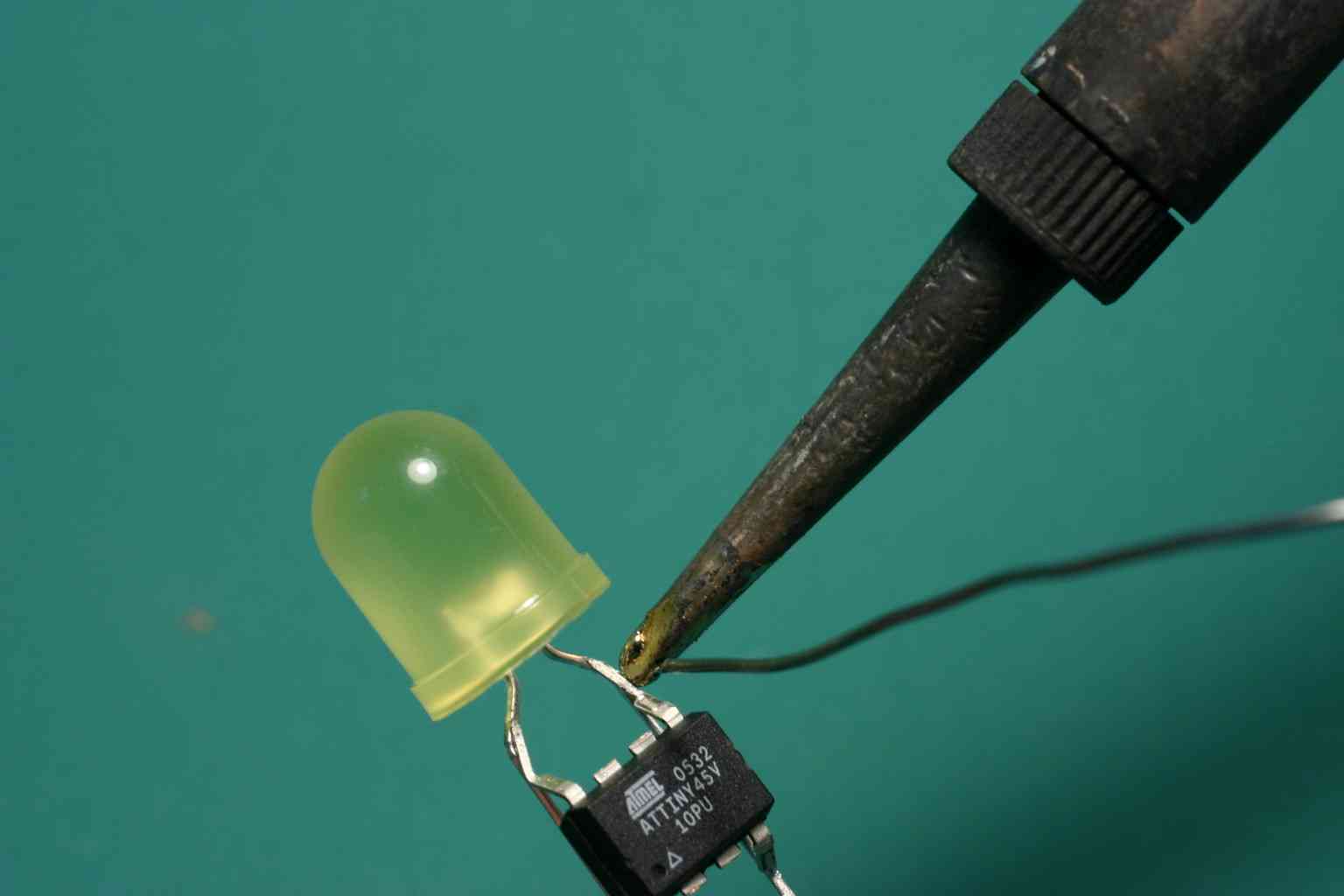 LED Throwies are an inexpensive way to add color to any ferromagnetic surface in your neighborhood. A Throwie consists of a lithium battery, a 10mm diffused LED and a rare-earth magnet taped together. Throw it up high and in quantity to impress your friends and city officials. We met the folks from the lab at the MakerFaire; built a few throwies under their direction; and then computerized one using a part loaded with MorseCompanion that we'd been showing off the day before.; ATtiny45 ; --v-- ; +--- rst -|-----|- vcc --->|-+ ; --- | | | ; ----- | | | ; +--- gnd -|-- --|- keyout ---+ ; ----- ; 8MhzMechanically this worked out great. We just clipped off the unused pins; layed the part across the leads of the LED; soldered; and then cut a gap in the ground lead that the computer would electrically "close" to make the Throwie light. PatCunningham has written an "instructable" for this project and we offer our own version of step-by-step instructions below. Step-by-Step Instructions This project is a "mashup" of two projects offered at the MakerFaire. You will need parts from the GRL Throwie kit and the Cybords MakerProject kit. Step 1 Locate the #1 computer from the cyboards kit. This is a Atmel AVR Tiny45 (ATTINY45V) preprogrammed with MorseCompanion. Remove the label which is for identification only. Step 2 Remove unused pins. Bend the center pins back and forth until they break off. Do not remove the pins located in the four corners of the part. Step 3 Bend remaining pins. Bend each pin 45 degrees away from the center of the part. Then bend the thiner part of each pin an additional 45 degrees until they are horizontal. Step 4 Locate a large light-emitting diode (LED) in the GRL kit. Bend both of its pins so that it is has the same spacing as the pins on the computer. Step 5 Position the computer. Orient the computer so that the top-side (pins 5 and 8) overlay the LED. The pin one marker, a small dot molded into the computer's plastic case, will align with the longer of two leads. Hold the computer in place with needle-nose pliers. Step 6 Solder the pins. Heat both leads and then apply a small amount of solder. Wait for it to flow. Hold the LED by hand and solder the fourth pin the same way. The computer/throwie should look like this. Step 7 Use diagonal cutters to cut the ground (minus) lead between the two pins on the computer. Make a second cut nearby and remove a small amount of metal so that current cannot flow except through the computer. Step 8 Locate the Lithium-Ion battery in the GRL kit. Identify it's plus (+) side. Step 9 Test the part by holding the longer lead against the plus side and the shorter lead against the minus side of the battery. If the light does not light and blink, try reversing the connection or try a fresh battery. Step 10 Tape the leads. Tape one side, fold, then tape the other. Start at the end of the tape so that there is free tape remaining after taping both sides. Step 11 Locate a Rare-Earth magnet in the GRL kit. Place it against the first side taped and continue tapeing so that the LED leads and the magnet are held firmly in place. This completes the ComputerizedThrowie. It should be blinking brightly. The magnet is strong enough to lodge the throwie agains ferrous serfaces even when thrown from some distance. Here the thowie is adhearing to the handle of the pliers used to construct it. See animated versions of these pictures here: We don't yet know how long the batteries will last. The non-computerized versions last a week or so. The computer takes some additional power but saves some power too by not running the light continuously. The computer will detect low voltage and reset. There may be sufficient battery life left for other applications.