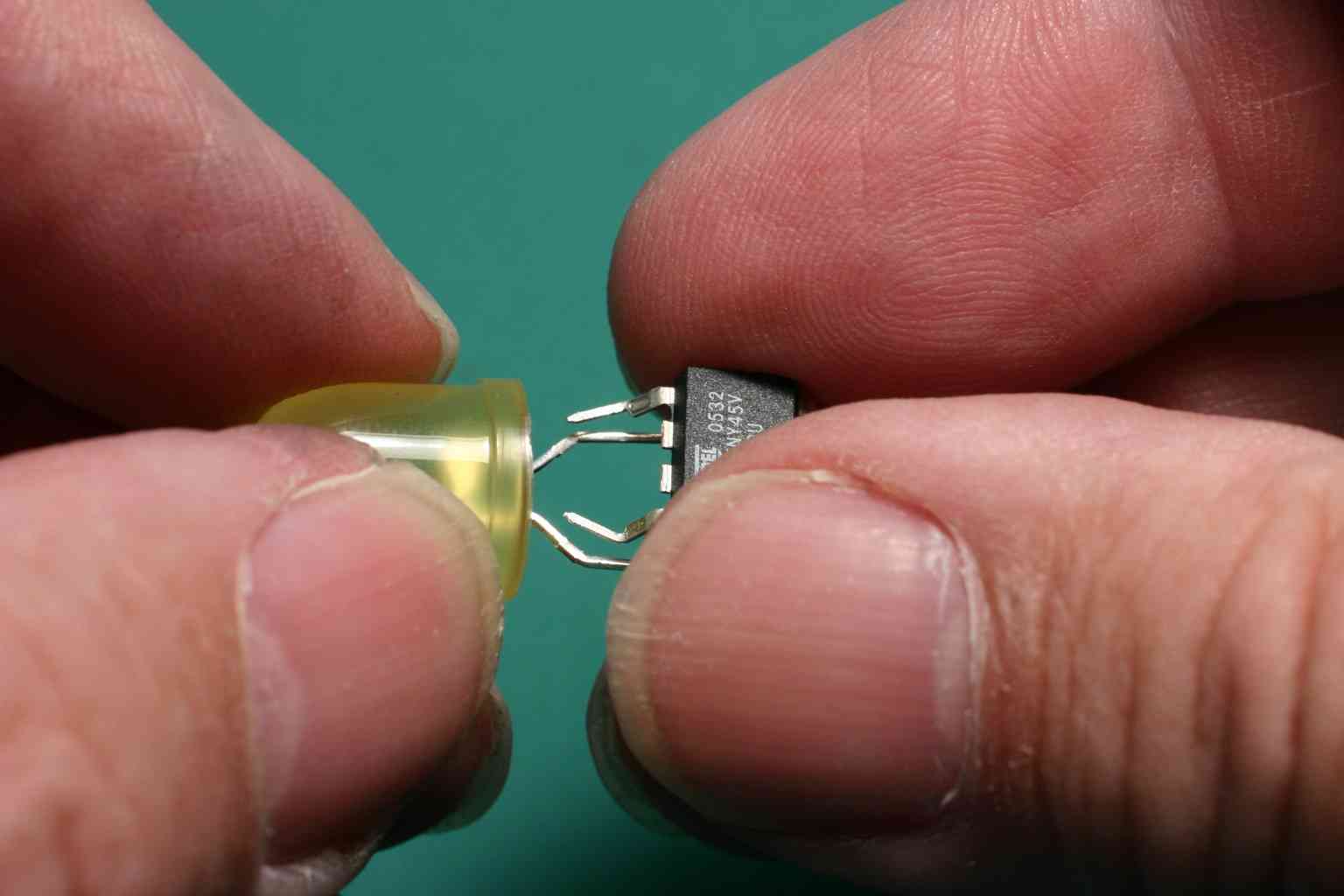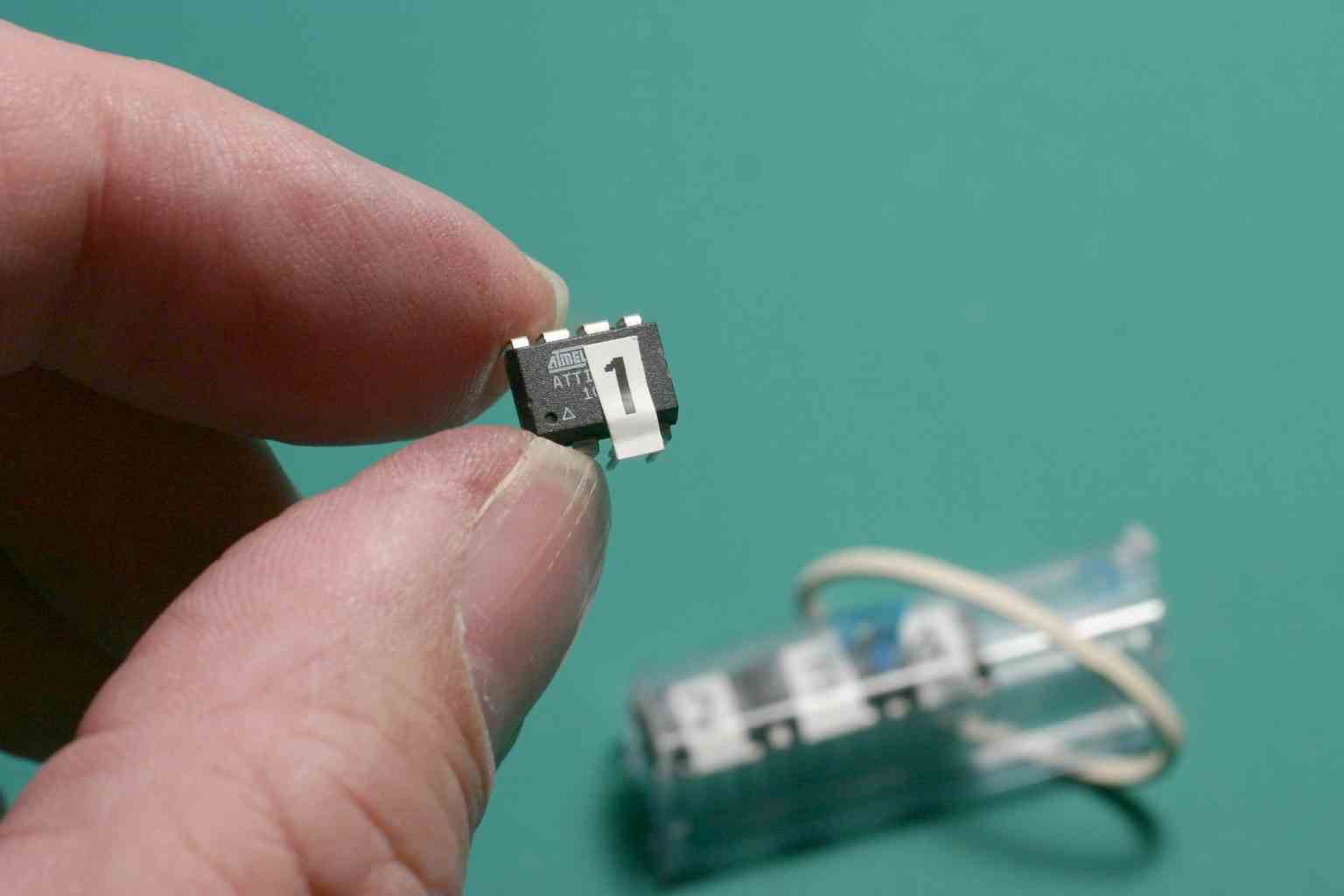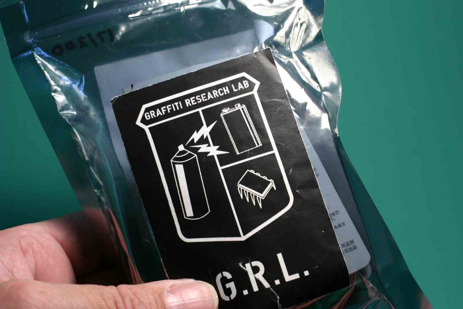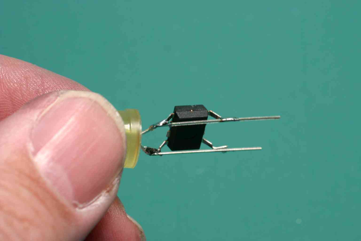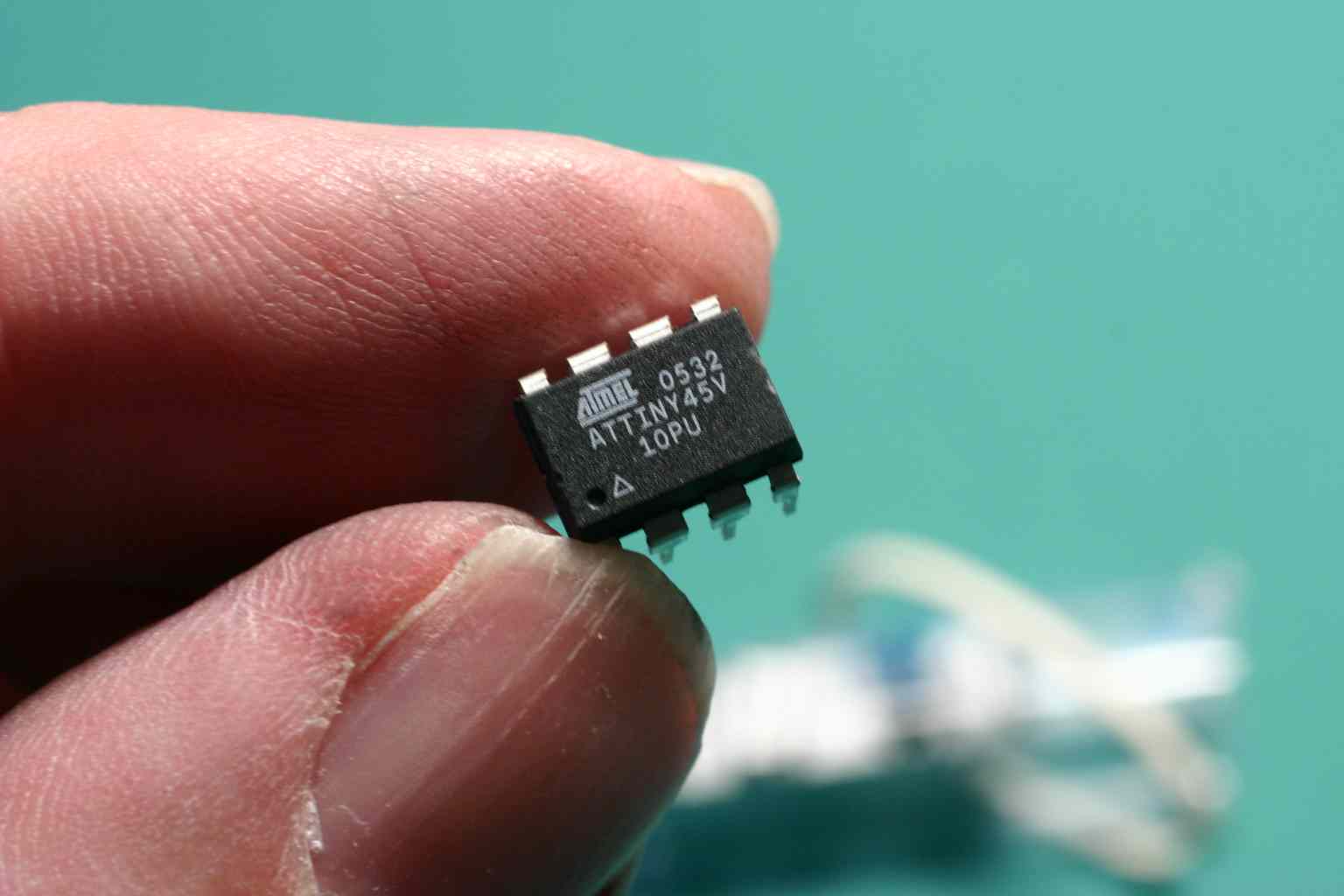 LED Throwies are an inexpensive way to add color to any ferromagnetic surface in your neighborhood. A Throwie consists of a lithium battery, a 10mm diffused LED and a rare-earth magnet taped together. Throw it up high and in quantity to impress your friends and city officials. We met the folks from the lab at the MakerFaire; built a few throwies under their direction; and then computerized one using a part loaded with MorseCompanion that we'd been showing off the day before.; ATtiny45 ; --v-- ; +--- rst -|-----|- vcc --->|-+ ; --- | | | ; ----- | | | ; +--- gnd -|-- --|- keyout ---+ ; ----- ; 8MhzMechanically this worked out great. We just clipped off the unused pins; layed the part across the leads of the LED; soldered; and then cut a gap in the ground lead that the computer would electrically "close" to make the Throwie light. PatCunningham has written an "instructable" for this project and we offer our own version of step-by-step instructions below. Step-by-Step Instructions This project is a "mashup" of two projects offered at the MakerFaire. You will need parts from the GRL Throwie kit and the Cybords MakerProject kit. Step 1 Locate the #1 computer from the cyboards kit. This is a Atmel AVR Tiny45 (ATTINY45V) preprogrammed with MorseCompanion. Remove the label which is for identification only. Step 2 Remove unused pins. Bend the center pins back and forth until they break off. Do not remove the pins located in the four corners of the part. Step 3 Bend remaining pins. Bend each pin 45 degrees away from the center of the part. Then bend the thiner part of each pin an additional 45 degrees until they are horizontal. Step 4 Locate a large light-emitting diode (LED) in the GRL kit. Bend both of its pins so that it is has the same spacing as the pins on the computer. Step 5 Position the computer. Orient the computer so that the top-side (pins 5 and 8) overlay the LED. The pin one marker, a small dot molded into the computer's plastic case, will align with the longer of two leads. Hold the computer in place with needle-nose pliers. Step 6 Solder the pins. Heat both leads and then apply a small amount of solder. Wait for it to flow. Hold the LED by hand and solder the fourth pin the same way. The computer/throwie should look like this. Step 7 Use diagonal cutters to cut the ground (minus) lead between the two pins on the computer. Make a second cut nearby and remove a small amount of metal so that current cannot flow except through the computer. Step 8 Locate the Lithium-Ion battery in the GRL kit. Identify it's plus (+) side. Step 9 Test the part by holding the longer lead against the plus side and the shorter lead against the minus side of the battery. If the light does not light and blink, try reversing the connection or try a fresh battery. Step 10 Tape the leads. Tape one side, fold, then tape the other. Start at the end of the tape so that there is free tape remaining after taping both sides. Step 11 Locate a Rare-Earth magnet in the GRL kit. Place it against the first side taped and continue tapeing so that the LED leads and the magnet are held firmly in place. This completes the ComputerizedThrowie. It should be blinking brightly. The magnet is strong enough to lodge the throwie agains ferrous serfaces even when thrown from some distance. Here the thowie is adhearing to the handle of the pliers used to construct it. See animated versions of these pictures here: We don't yet know how long the batteries will last. The non-computerized versions last a week or so. The computer takes some additional power but saves some power too by not running the light continuously. The computer will detect low voltage and reset. There may be sufficient battery life left for other applications.