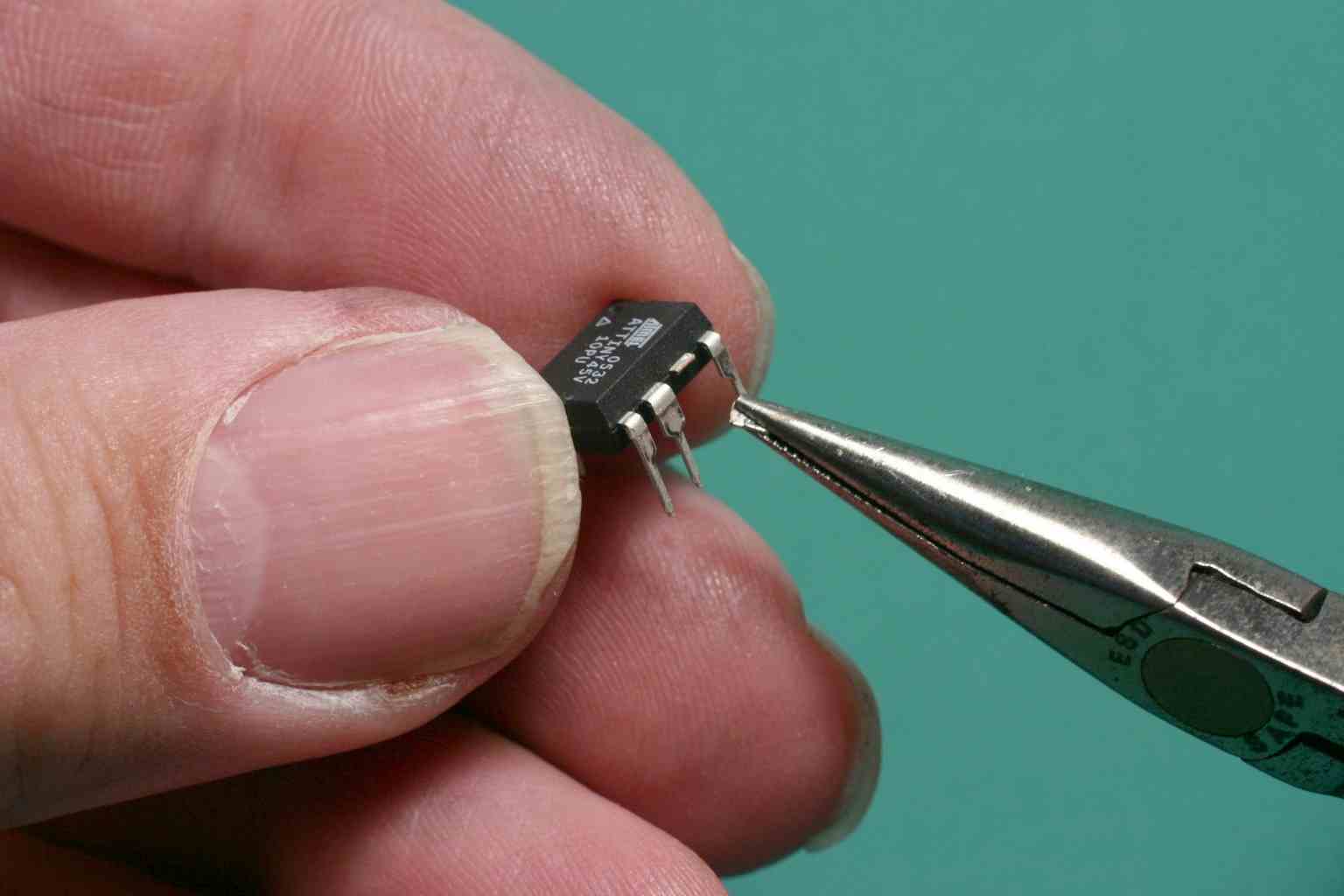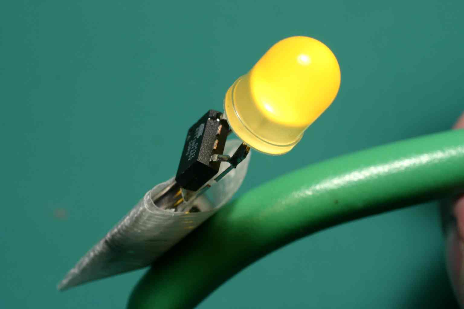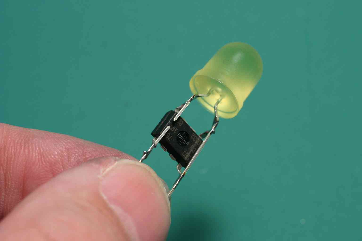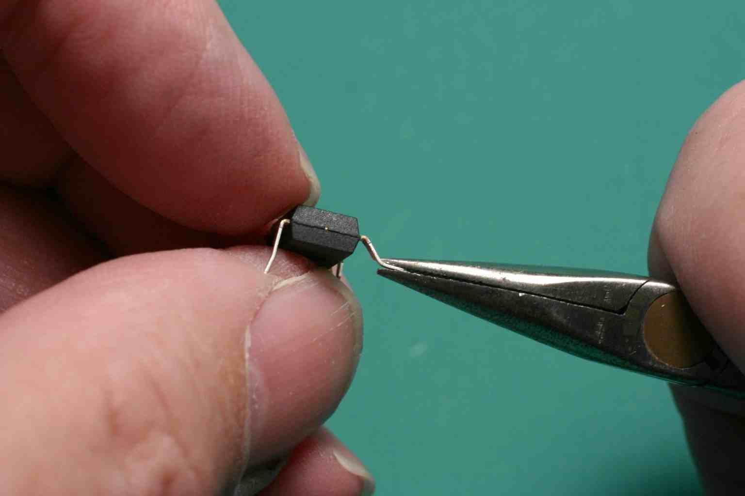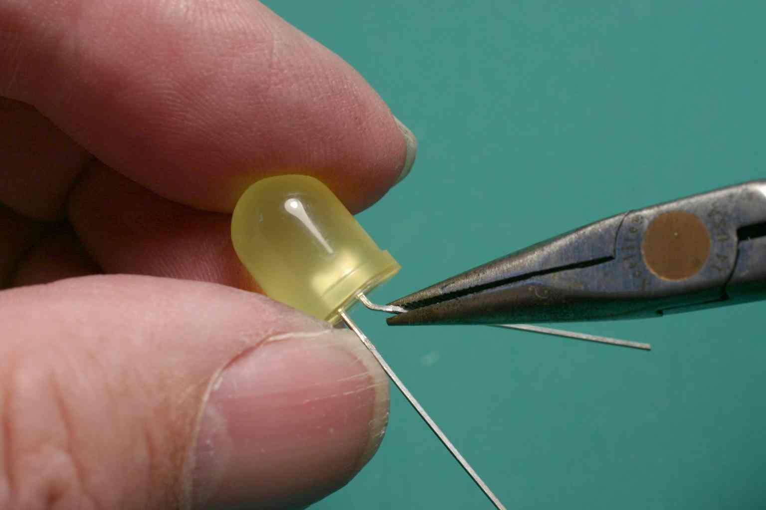 LED Throwies are an inexpensive way to add color to any ferromagnetic surface in your neighborhood. A Throwie consists of a lithium battery, a 10mm diffused LED and a rare-earth magnet taped together. Throw it up high and in quantity to impress your friends and city officials. We met the folks from the lab at the MakerFaire; built a few throwies under their direction; and then computerized one using a part loaded with MorseCompanion that we'd been showing off the day before.; ATtiny45 ; --v-- ; +--- rst -|-----|- vcc --->|-+ ; --- | | | ; ----- | | | ; +--- gnd -|-- --|- keyout ---+ ; ----- ; 8MhzMechanically this worked out great. We just clipped off the unused pins; layed the part across the leads of the LED; soldered; and then cut a gap in the ground lead that the computer would electrically "close" to make the Throwie light. PatCunningham has written an "instructable" for this project and we offer our own version of step-by-step instructions below. Step-by-Step Instructions This project is a "mashup" of two projects offered at the MakerFaire. You will need parts from the GRL Throwie kit and the Cybords MakerProject kit. Step 1 Locate the #1 computer from the cyboards kit. This is a Atmel AVR Tiny45 (ATTINY45V) preprogrammed with MorseCompanion. Remove the label which is for identification only. Step 2 Remove unused pins. Bend the center pins back and forth until they break off. Do not remove the pins located in the four corners of the part. Step 3 Bend remaining pins. Bend each pin 45 degrees away from the center of the part. Then bend the thiner part of each pin an additional 45 degrees until they are horizontal. Step 4 Locate a large light-emitting diode (LED) in the GRL kit. Bend both of its pins so that it is has the same spacing as the pins on the computer. Step 5 Position the computer. Orient the computer so that the top-side (pins 5 and 8) overlay the LED. The pin one marker, a small dot molded into the computer's plastic case, will align with the longer of two leads. Hold the computer in place with needle-nose pliers. Step 6 Solder the pins. Heat both leads and then apply a small amount of solder. Wait for it to flow. Hold the LED by hand and solder the fourth pin the same way. The computer/throwie should look like this. Step 7 Use diagonal cutters to cut the ground (minus) lead between the two pins on the computer. Make a second cut nearby and remove a small amount of metal so that current cannot flow except through the computer. Step 8 Locate the Lithium-Ion battery in the GRL kit. Identify it's plus (+) side. Step 9 Test the part by holding the longer lead against the plus side and the shorter lead against the minus side of the battery. If the light does not light and blink, try reversing the connection or try a fresh battery. Step 10 Tape the leads. Tape one side, fold, then tape the other. Start at the end of the tape so that there is free tape remaining after taping both sides. Step 11 Locate a Rare-Earth magnet in the GRL kit. Place it against the first side taped and continue tapeing so that the LED leads and the magnet are held firmly in place. This completes the ComputerizedThrowie. It should be blinking brightly. The magnet is strong enough to lodge the throwie agains ferrous serfaces even when thrown from some distance. Here the thowie is adhearing to the handle of the pliers used to construct it. See animated versions of these pictures here: We don't yet know how long the batteries will last. The non-computerized versions last a week or so. The computer takes some additional power but saves some power too by not running the light continuously. The computer will detect low voltage and reset. There may be sufficient battery life left for other applications.