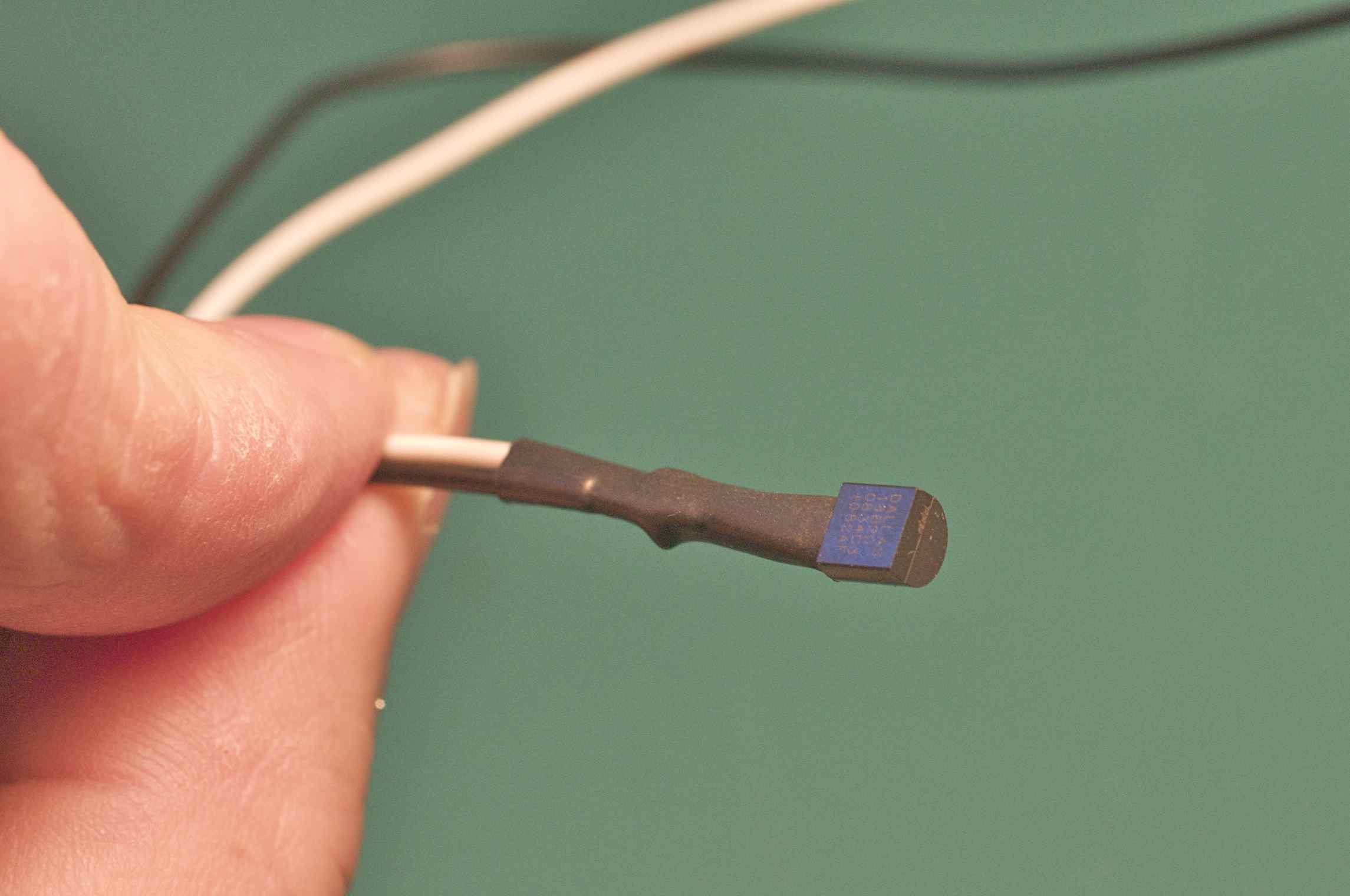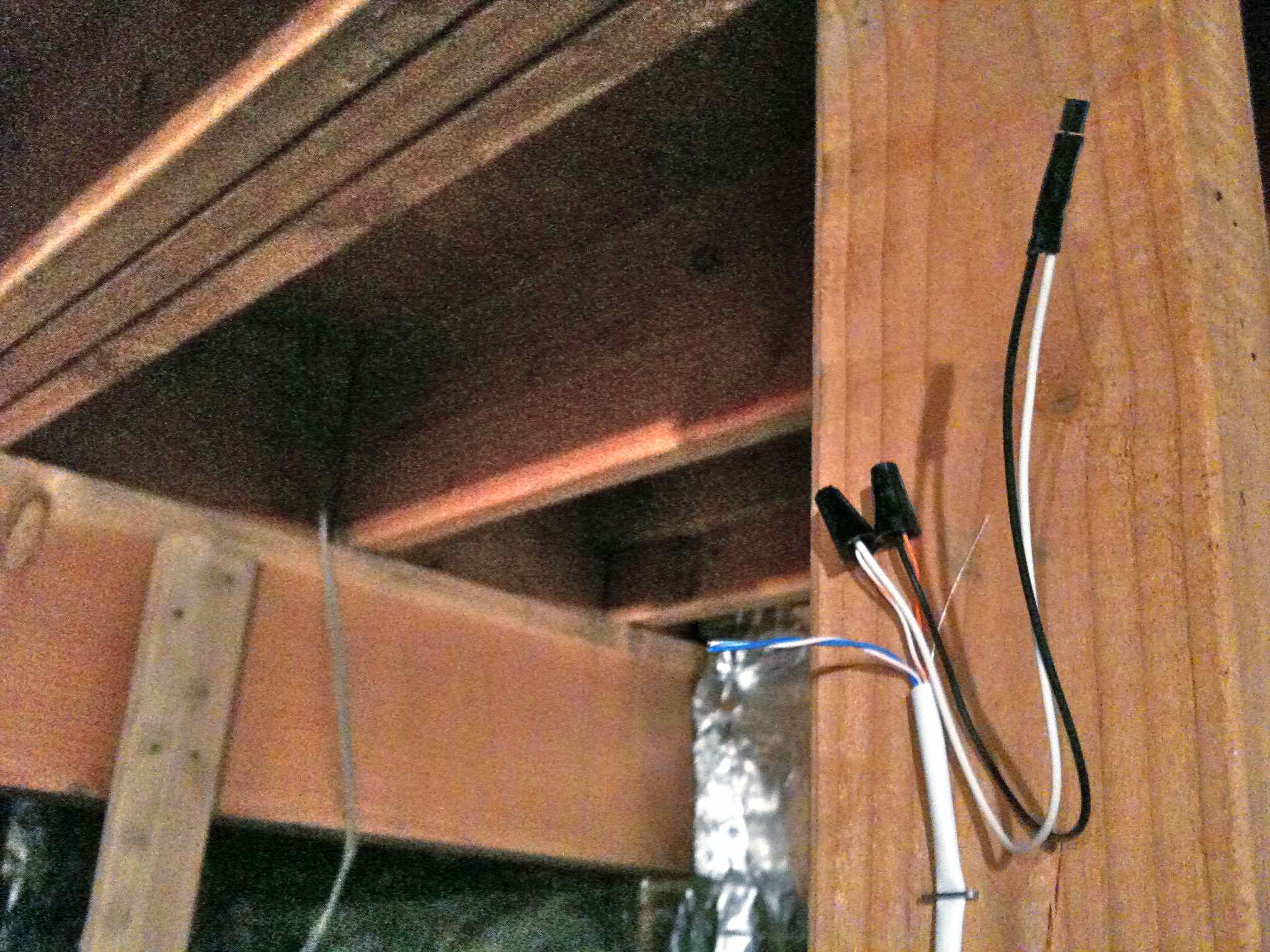 This is how I've come to package up these parts for distribution around my house. I've got a long run of CAT-3 bell wire running up and down the stairs. I cut into this and attached the one wire device with wire nuts.