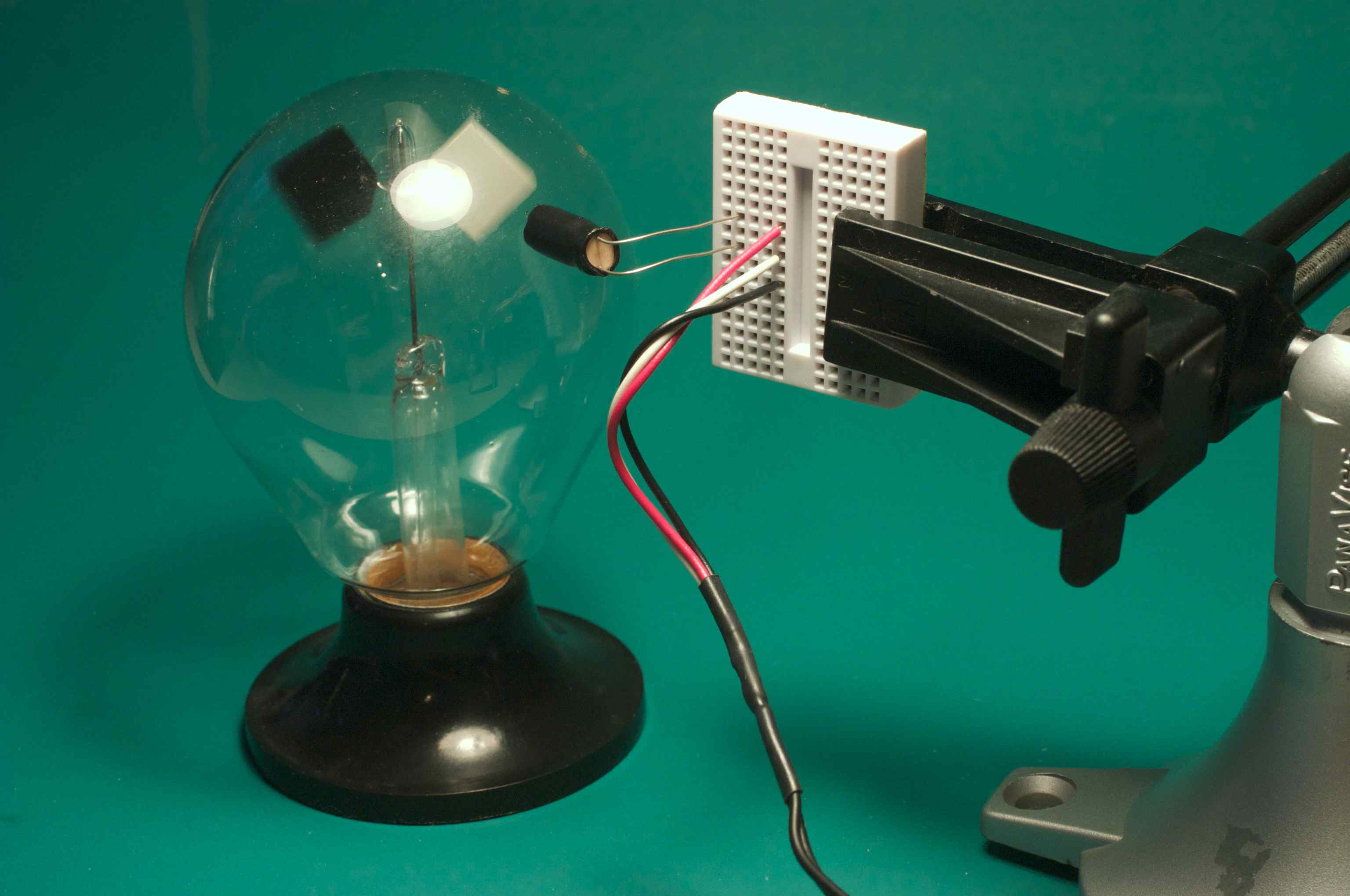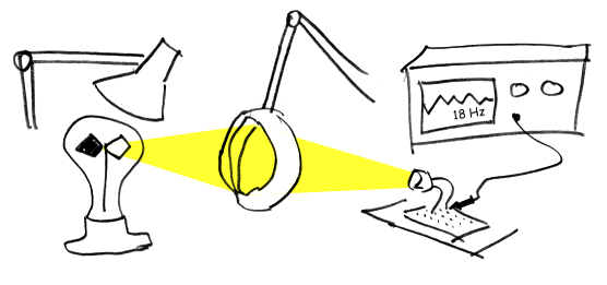 I found that I was getting on and off the rollers over and over while debugging. This didn't make for a very interactive development environment. I struggled unsuccessfully to operate my oscilloscope and computer while pedaling. I needed another approach. One innovation was to substitute a Radiometer for the roller as it would spin just fine without any effort on my part. I bet you were wondering what a Radiometer was good for. Now you know. I had used a magnifying lamp to image my Radiometer on a CdS cell before. Here is the sketch I made in 2001 of what I then called a Radiometer Speedometer.
