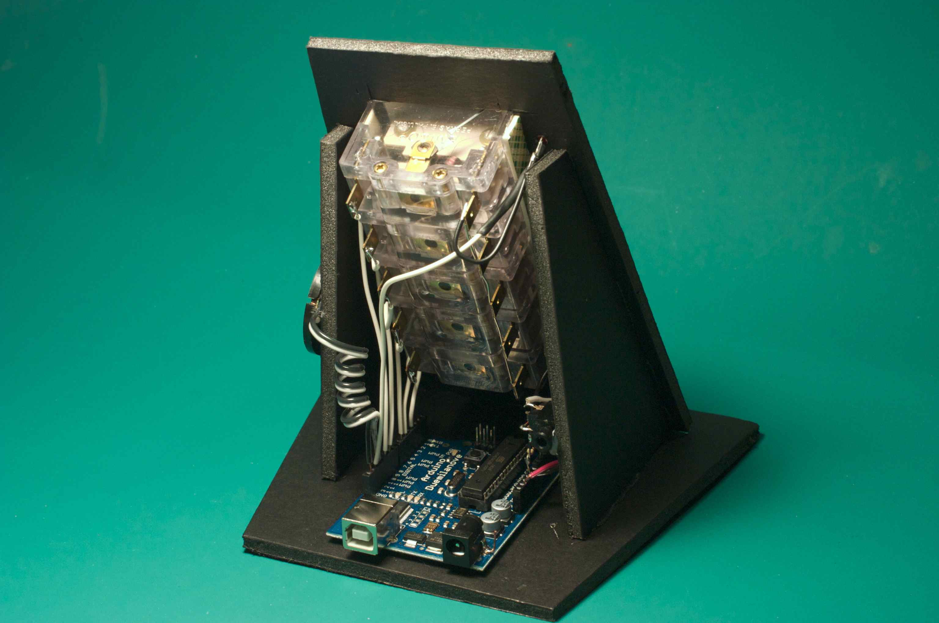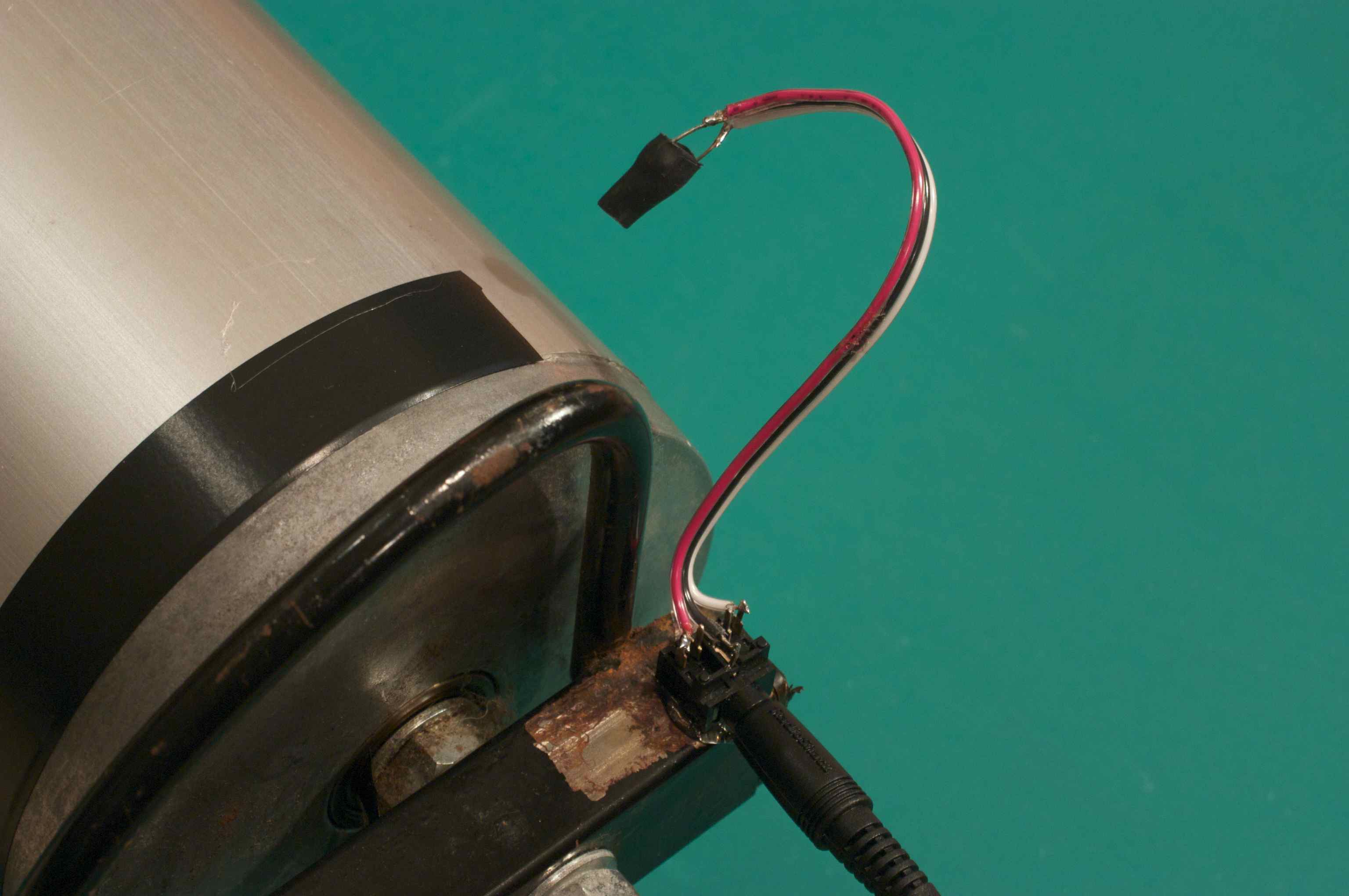 The spinometer connects to the rollers' pickup with 1/8 inch stereo patch cable. I attached the jack to the roller frame with HotMeltGlue and then ran stiff wire to the CdS photo cell which was positioned by bending so as to see light and dark flashes created by black electrical tape wrapped half-way around the roller. A little heat-shrink tubing over the cell blocks unwanted light.