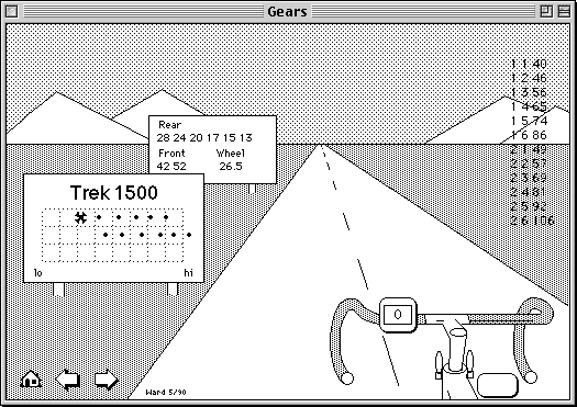 I started bicycle riding in ernest around 1985. Soon after I wrote this stack to compare gear ratios of my new racer with my older bikes. Later I added more bikes to my collection and added friends bikes to my stack. I added a second background that looked like a mountain bike when that became popular. The pedals are buttons. If you click them in an alternating fashion then the speedometer will read out miles per hour for the gears you have selected. The numbers on the right hand side of the screen are the gear inches of each gear combination. This is the same as the diameter of a non-geared wheel (remember those old time bikes?) that would go the same speed.
