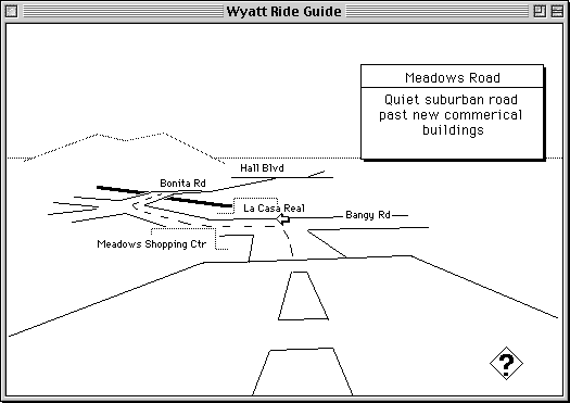 I often rode my bike over lunch while I worked for Wyatt Software. This is a stack that traces the first few miles of my regular 18 mile route. I was also riding regularly with the Portland Wheelmen and learned a lot of countryside from their maps. Here I was experimenting to see if I could make a better route map. I figured that you had to see past the horizon to really grok the route. A series of photographs wouldn't work. So I drew a half dozen route sketches that looked beyond the line of sight, kinda like the New Yorker's view of the country that shows the Hudson river as about half way to California. The arrows are buttons that advance through the stack. They also cue changes of direction and offer an occasional choice of route.