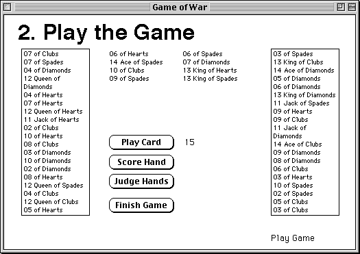 I often write stacks with my kids. This one came up after playing a game or two of war over lunch at the local pub. War is a simple minded game with no real choices. You just go through the motions and see what happens. I thought it would be fun to see the balance of power shift back and forth as game after game were played at high speed. The stack uses text fields to store each player's hands. These grow and shrink as a player's fortune waxes and wains. A few more cards in the stack deal the hands and collect statistics on the play. Real strength moves back and forth with the aces, not the total number of cards.